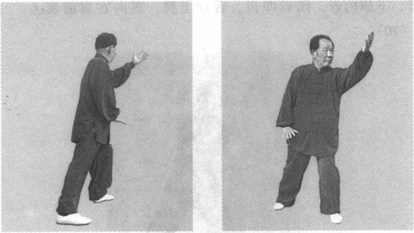 ①接前势。两腿不动。右手挥掌向西南方挑出,掌心向左, 虎口在上,五指自然叉开向前上方;左掌按捋下,掌心向下,虎 口在里,五指自然叉开向右,护在左胯旁。眼向右掌前视去。 (S3-71)