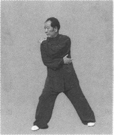 接前势。身体右转,面向西南方。左脚原地不动,随转体挺 直成箭步;右腿屈膝成弓步。同时,左手反掌往右肩尖抓去,掌 心向下,虎口在里,五指微屈向右后;右手向左肋下抱去,掌心 向里,虎口在上,五指自然叉开向左后。全身成捆绑势。头顶项 竖,下须内收,闭唇叩齿,舌顶上腭,眼向右肩前视去。(图 3-70)
