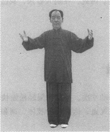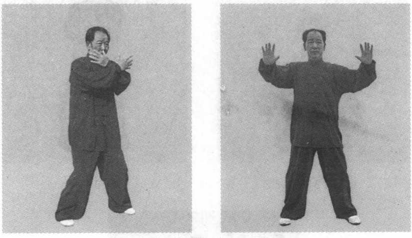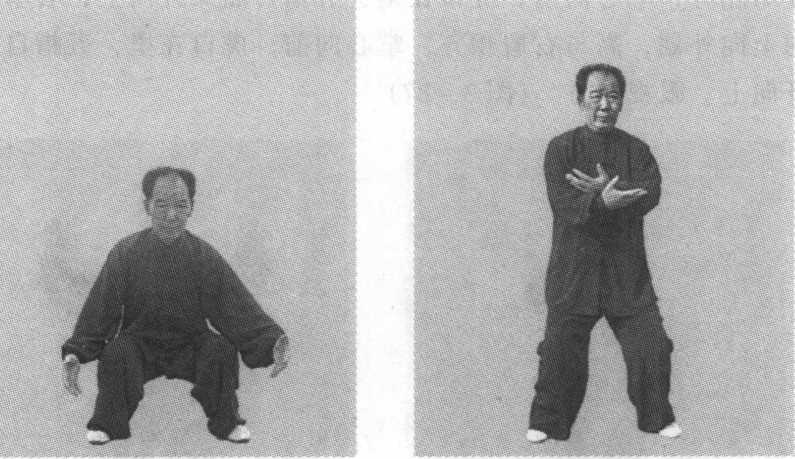 运动时一定要缓慢、舒松,使气慢慢地、均匀地由身体中丹 田送到下丹田。两臂相交成十字剪手时,手在胸前不能过高。两 手从外向里收拢,意在丹田抱气。身体上起时是两膝上挺之力, 双掌上捧,头带领全身。头要上顶,腰部松沉直立,是练习腿 力、腰力、臂力的最好式子。整个动作要刚柔相济,松静自然, 不可用僵力、蛮力。收式还原,要静心静气,心态平和,调匀气 息,回归原状。