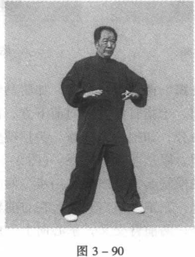 肩前翻掌,掌心向下,虎口在里;右掌向右划圆,到右肩前翻 掌,掌心向下,虎口在里;两掌向下按下,一直到丹田小腹前上 方;十指微相对,成按浮势;双手如同按住一个大球,如水中按 瓢一样。眼向正前方视去。(图3-90)