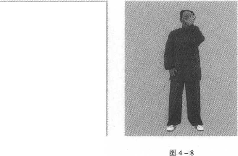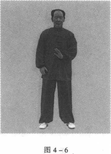 站立同前。左手掌由胸前中心起点开始,掌心向前,虎口向 右,五指自然叉开向上。然后,向右f向上f向左f向下f回到 起点,为一周,在身体前面划圆。这样划圆与右手划圆的方向相 反,即逆时针方向。(图4-6至图4-10)图4-1 图4-2图4-3图4-3图4-4图4-4图4-3图4-3图4-4图4-4图4-7O 11-4 图9-4图