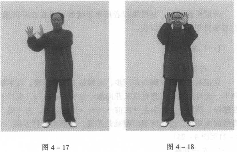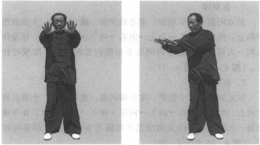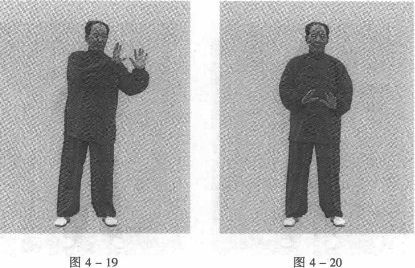1. 右划圆站立同前。双手竖掌,掌心均向前,虎口相对,十指自然叉 开向上。然后,向左f向上f向右f向下f回到起点,在身体前 面划一大圆。划圆的方向同右手划圆的方向相同,即顺时针方 向。(图4-11至图4-15)2. 左划圆站立同前。双手竖掌,掌心均向前,虎口相对,十指自然叉 开向上。然后,向右-向上-向左-向下-回到起点,在身体前 面划一大圆。划圆的方向同左手划圆的方向相同,即逆时针方 向。(图4-16至图4-20)图 4-11图 4-11图 4-12图 4-12图 4-11图 4-11图 4-12图 4-12