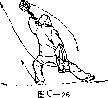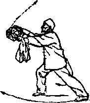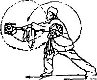 1上体右转成右弓步,同时右锤向右侧砸下至与府平并继续向下经体前向左侧后划弧至左腋下锤头向左手心向体,左锤向上、向前砸下高与肩平锤头向前手心向右,目视左锤(图-20)