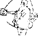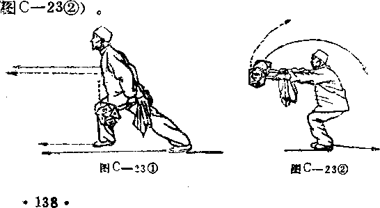2左脚向前进一步右脚向左脚后插进,双腿稍屈成高歇步5同时左锤向下、向右后侧、向上、向左、向下经体前向右侧划立圆至体右侧右锤向下经体前向右侧、向上再向左侧、向下划立圆至体左侧两臂交于胸前手心均向后左锤头向右右锤头向左目视右锤(图-21)。