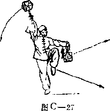 2右脚后撤一步上体继续右转重心移至右脚左脚随之提起成左提膝平衡同时右锤由下向上方直冲出右臂伸直手心向左锤头向上,左锤向左侧下落至左腿外侧手高与肩平手心向后锤头向下目视左侧(图一27)