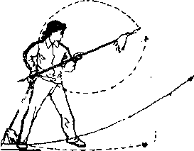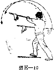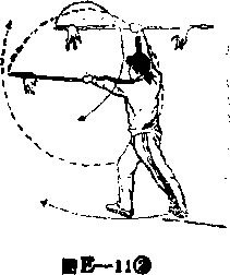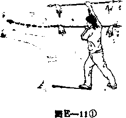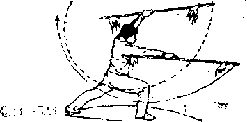 2双脚不动右手内旋随之向上举起至头右侧上方手心向右虎口向前,左手外旋并回收至右胸前随之向前刺出,高与肩平手心向上虎口向前双枪身与地面平行3目视前方(图-1、图—112)。