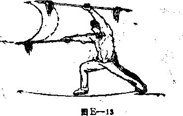 2右脚前进一步成右弓步同时左手枪向右向下狗左上划弧体至左侧上方左臂伸直手心向左后方虎口向前右手枪向前刺出高与肩平手心向左虎口向前双枪身与地面平行3目视前方(图-13)。
