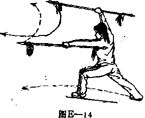 3左脚前进一步成左弓步同时,左手下落至腰间再向轮刺出高与肩平手心向右,虎口向前右手向上划抬至体右侧上方右臂伸直手心向右虎口向前双枪身与地面平行目视前方(图—14)。