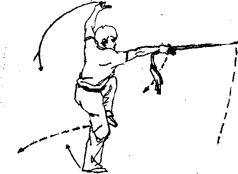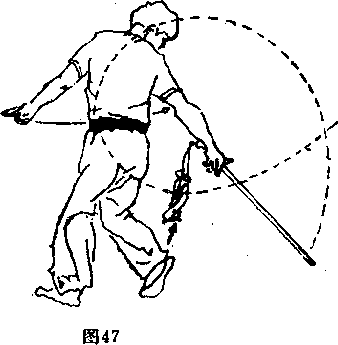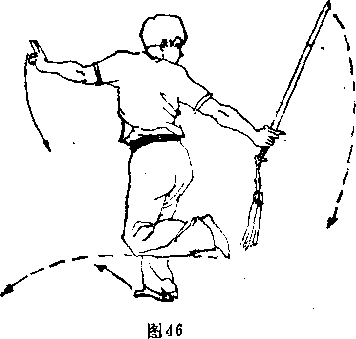 (3) 上动微停,左脚向左(西)上步,重心移至左腿,微 屈膝,右腿随后离地向后撩起。在左脚上步的同时,右手捶剑 以腕为轴,使剑向右侧下方降落,剑尖朝右斜下方;左臂在左 侧下落至左斜下方,剑指高约与腰平,手心朝下,手指朝左。 眼视剑尖(图47 )。