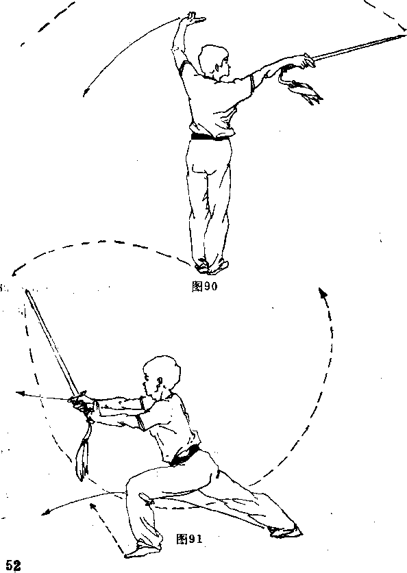 左剑指向左侧下摆;左脚向左迈步。身体随即左转约90°向 东。左腿屈膝半蹲,右腿伸直成左弓步。同时,右手握剑经上 向前(西)盖劈,手心朝左,剑尖朝前上方,左剑指随势附在 右腕外侧,手心朝前下;眼视前方(图91 )。.要点:劈剑时,右臂由屈到伸,力达剑身?