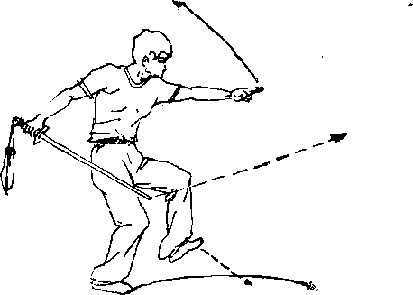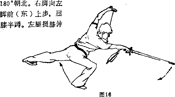 (1) 左脚向左 (东)落步,右脚离地 提起向左脚处落步?左脚立即以脚掌蹬地 向前上眺起,将位置 让于右脚。两腿屈膝。左脚略离地面,脚尖 勾起(图15)。(2) 上动不停,左脚向左前(东)落步,随之身体左转约 图15直成右弓步,在左脚落步的同时,左剑指朝头顶上方屈肘架起, 手心朝前上,手指向右I右手握剑向前(东)刺出,手心朝体 前,剑尖高与眼平。眼视剑尖(图16 )。要点:眺步要远,重心起伏不要太大。眼必须始终注视刺 剑方向9做弓步架刺时,上下须协调一致。