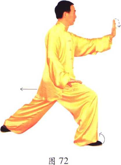 搂膝推掌时,上体前倾,手臂、手 腕、手指僵直,右肩耸立。