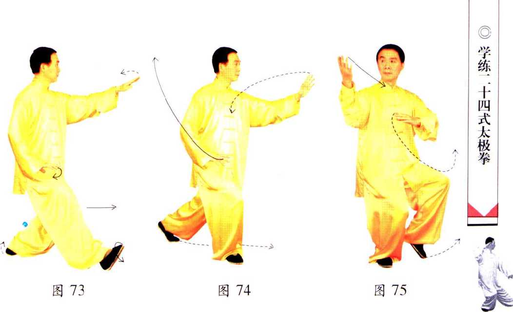 上体慢慢后坐,左腿缓缓屈膝, 重心移至左腿上;右腿自然伸 直,右脚尖翘起微向外撇,随即 右腿慢慢屈膝前弓,身体右转, 重心移至右腿上;左脚向右脚 内侧靠拢,脚尖点地成左丁步; 同时右手外旋向外翻掌由右后 向上划弧至右肩外,肘微屈,手 与耳高,掌心斜向上;左手随转 体向上向右下划弧至右胸前, 掌心斜向下。