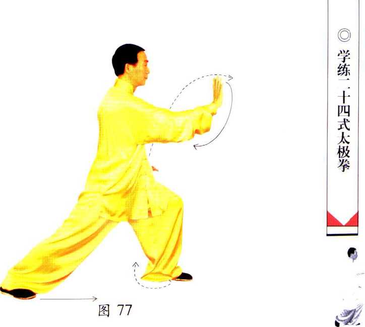 搂膝推掌时,松腰沉跨,两肩松 沉,两肘微屈,坐腕舒掌。