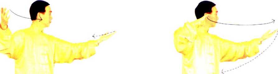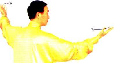 以腰为轴,随身体缓缓向右转,左 掌向前,右掌向后,两掌心在体前 交错;左掌推至右掌后慢慢地坐 腕、展掌、舒指,肘微屈。