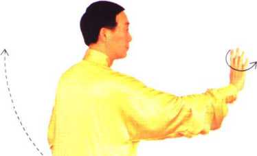 上体微向右转,右肘后抽,右掌由 右下向右后上方划弧至右肩外 侧,掌心斜向上,与耳同高,肘微 屈;同时左手臂在体前外旋翻掌, 微向前伸,掌心向上,肘微屈;重 心仍在右腿上。