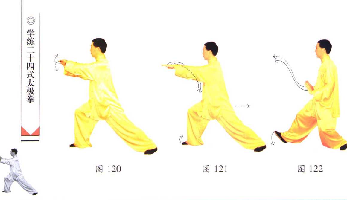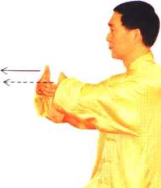 上体向右转,同时左手向上向前划 弧屈肘附于右手腕内侧,掌心向 前,掌指斜向上,与右手脉门相距 约寸许(3?5厘米);右掌心向内, 掌指朝左;两肘微屈,两臂在胸前 搠圆;重心仍在左腿。