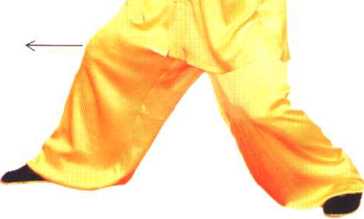 身体重心由左腿逐渐前移,右 腿屈膝前弓,左腿自然伸直,成 右弓步;重心落于两腿之间,略 偏后;同时两手一起向前缓缓 挤出;两掌似贴非贴,两肩松 沉,两肘微屈,两臂撑圆。