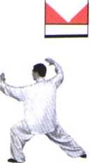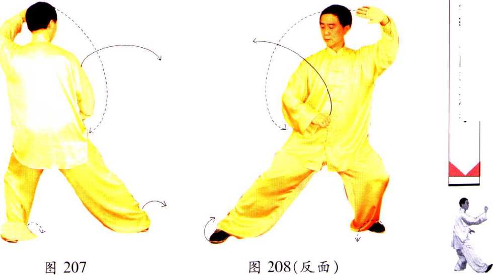 右腿屈膝半蹲,身体重心移至右 腿,上体向右后转,左脚掌离地, 脚尖上翘,脚跟着地,脚尖向里 扣;同时右手向右向下划弧,掌心 向外,掌指朝上,高与肩平;左手 向上向右划弧,掌心向夕卜,掌指向 上,高与肩平;两肘微屈。