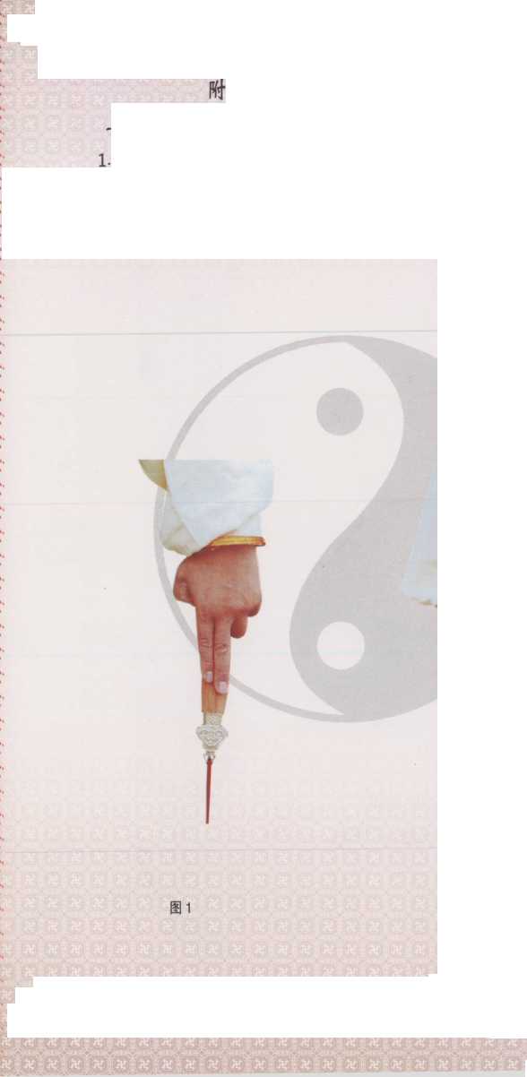左手自然展开,虎口对准剑护手,拇指由护手上方向下,无名指和小 指由护手下方向上,握住护手。食指、中指伸直附于剑把之上,剑身平贴 左前臂后侧,不得使剑刃触及身体(图1)。