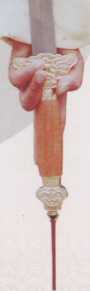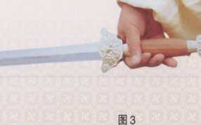 右手拇指和食指靠近护手将剑把 握紧控制剑身,其他三指松握于剑把 之上,掌心展开,以增加剑峰弹力和 运动的灵活性(图3)。