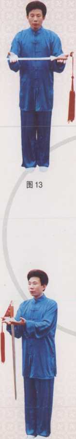 ① 双手托剑递:递剑者,并立 步,身体自然直立。左手托护手,右 手托剑身,双手平举,使剑平托于胸 前,目视接剑者(图13)。