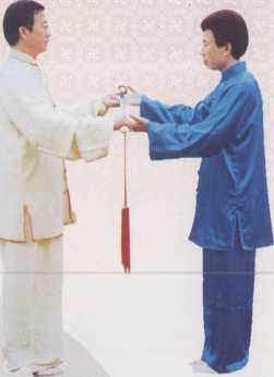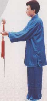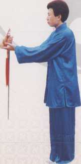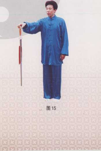③ 单手提剑递:递剑者,并立 步,身体自然直立。右手拇指、食指、 中指捏住剑柄的顶端,剑尖下垂,剑 身直立,剑刃朝左右,直臂举于体前, 目视接剑者(图15〉。