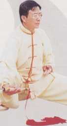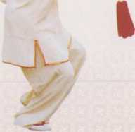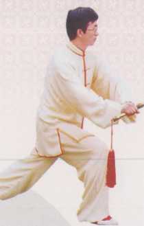 向右转体,重心在左腿,右脚提 起向前迈步,脚跟先着地;同时,右 手持剑翻转,掌心向下,左手附于右 手腕部;眼看剑尖方向(图4.2)。 动作要领: