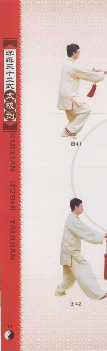 接上式,重心在左腿,右脚提起 收在左脚内侧,前脚掌踏地;右手持 剑平刃向前引伸,左手剑指落于右 手腕部;眼视剑尖方向(图4.1)。