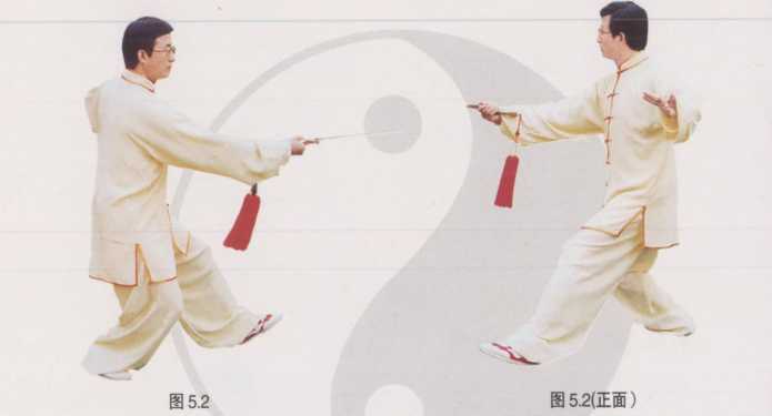 重心在右腿;左脚提起向前迈步,脚跟先着地;同时右手持剑翻转掌 心向上,左手剑指由腰部向体左侧划弧,掌心向外;掌指向前,眼视剑尖 方向(图5.2)。