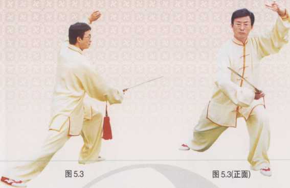 身体向左转,重心前移。左脚全脚掌踏实,左腿屈膝慢慢向前弓出,成 左弓步;右手持剑屈肘向左后方带至右肋旁,剑尖高于剑把;左手剑指向 上划弧举于左额前上方,掌心向外;掌指向右,眼视剑尖方向(图5.3)。 动作要领: