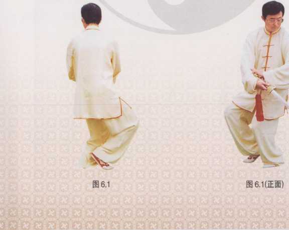 接上式,身体微向左转,重心在 右腿;左脚提起收至右脚内侧,前脚 掌踏地;右手持剑向前引伸,左手剑 指收至腰侧,掌心向上;掌指向前, 眼看剑尖方向(图5.1)。
