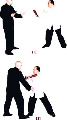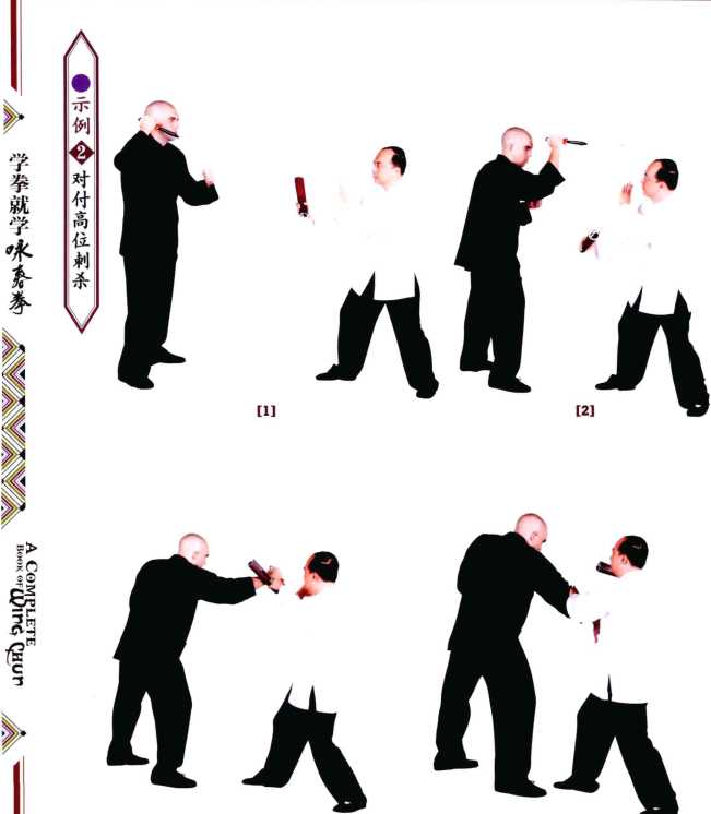 口-2对方右手持刀在下捅向我左腹部我侧身坐马在内门右手握书卷下打其持刀桥手