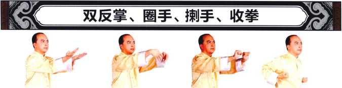 掌心朝上然后两手腕同时旋转使手指向内、向下、向上做圈手两手掌变拳手肘发力、稍稍收缩做喇手接着两臂分别向外翻转使拳心朝上双手回抽,双拳收至胸侧。