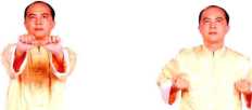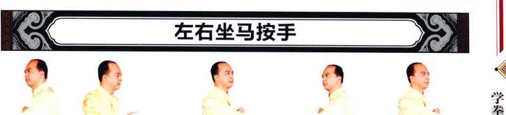 237钳阳马转左坐马(注意两脚依次提起落下)左拳变掌在左侧按下成左按手目视左手。