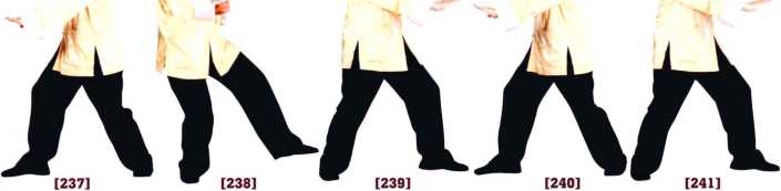 238-239左坐马转右坐马(注意两脚依次提起落下)左掌变拳收回同时右拳在右侧按下成右按手目视右手。