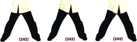 240-241右坐马转左坐马(注意两脚依次提起落下)右掌变拳收回左拳变掌在左侧按下成左按手目视左手。紧接着左坐马转右坐马(注意两脚依次提起落下)左掌变拳收回同时右拳在右侧按下成右按手目视右手。