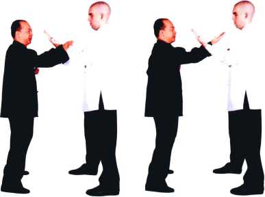 师父伏手变摊手做内圈手转入弟子摊手内侧弟子摊手不变。