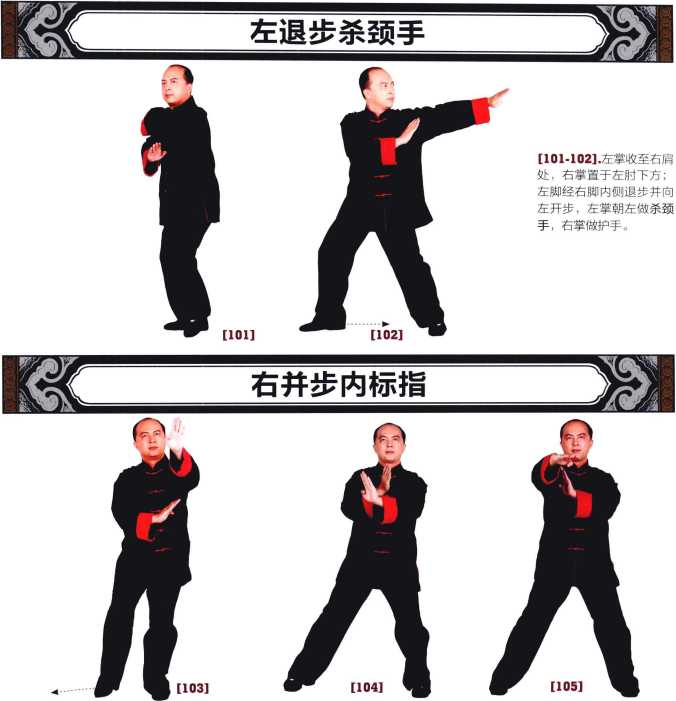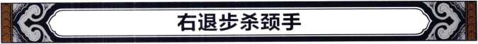 86-88右手指收至左肩处左掌置于右肘下方右脚经左脚内侧退步并向右开步右掌朝右做杀颈手左掌做护手。