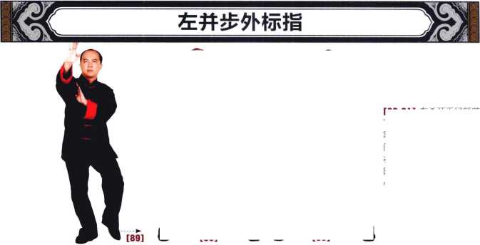 (左手左边)标出成左外标指右肘变护手右脚经左脚内侧45°上步成左坐马左指屈肘回收右指经左肘肘底与上步同时向右外门(右手右边)标出成右外标指左指平放于胸前掌心朝下。