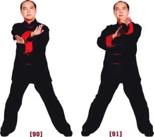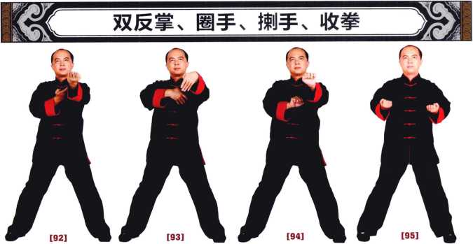 92-95双掌分别原位翻转掌心皆朝上然后两手腕同时向内、向下、向上旋转做圈手拳心向前两手掌变拳、手肘收缩做喇手接着两臂分别向外翻转使拳心朝上双手回抽双拳收至胸侧。