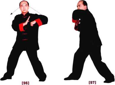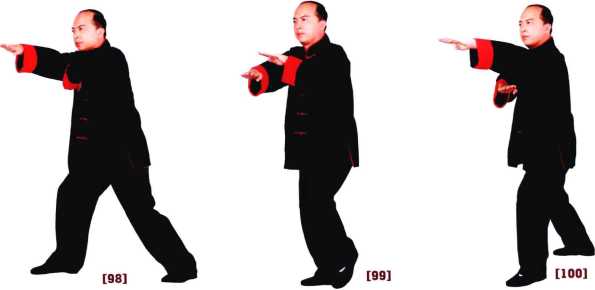 98-100腰身左转坐正右手向右内门(右手左边)标出成右内标指左掌略放平接着左脚经右野3侧4?°上步成右坐马右手屈时回收左指经右桥之上与上步同时向左内门(左手右边)标出成左内标指右指平放于胸前掌心朝下。