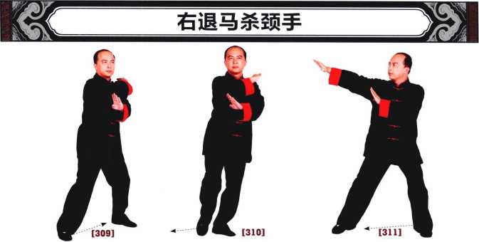 309311右掌收至左肩处掌心向下左掌置于右肘下右脚经左脚内侧退马并向右开步右掌朝右做杀颈手左手做