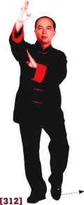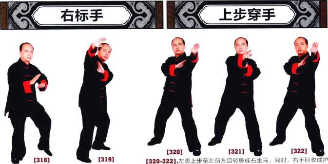 312-313右杀颈手曲肘经额前下落成按手左手肘底发力、掌心向下做标指在右按手之下脱手向前标出左脚同时并向右脚旋即向左开马成钳阳马目视前方。