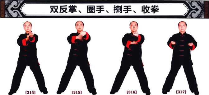 314-317双掌在原位翻转掌心皆朝上然后两手腕同时向内、向下、向上旋转做圈手拳心向前两手掌变拳、手肘收缩做喇手接着两臂分别向外翻转使拳心朝上双手回抽双拳收至胸侧。