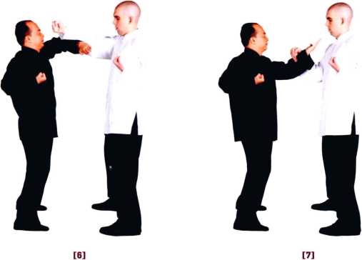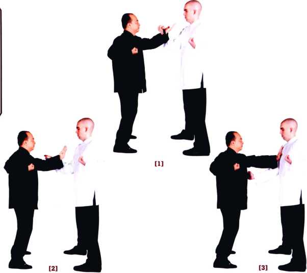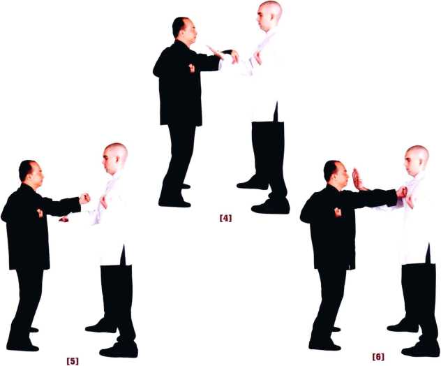 弟上摊下变圈手意欲甩手在师父桥下外门施展正掌击向师父而门师父伏手感知压力解脱立即变冲拳以直线击向对方胸口(直冲)此亦为甩手直冲之心法的另一应用。