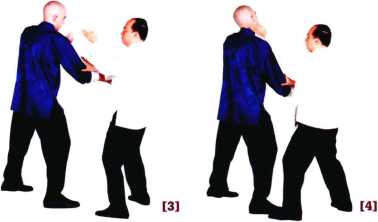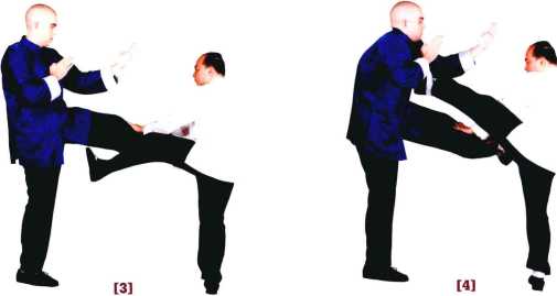 3-4我以字马已经避过对方正踢之攻击线以双按手拍击对方左脚胫骨同时我起左脚(交叉脚)正踢对方裆部或心门要害!对方左脚被我无情力下按加上前冲之势上身前俯必被我一脚踢中。