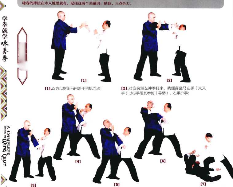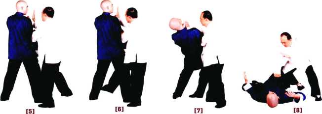 5-8我一招得手立即变招左掌下喇变按手继续控其右肘(占桥成第一点)右手以正掌击向对方面门同时右脚圈脚弧线经自己左脚内侧插至对方右脚后当我右正拿击中对方面门同时(第二点)我右脚跟发力后扫其右小腿后侧(第三点)三点一齐发力将对方摔倒。