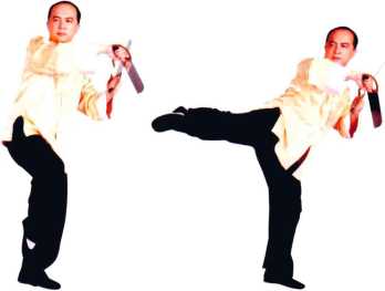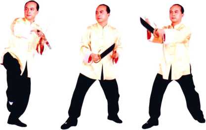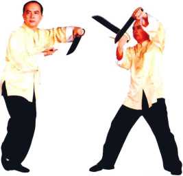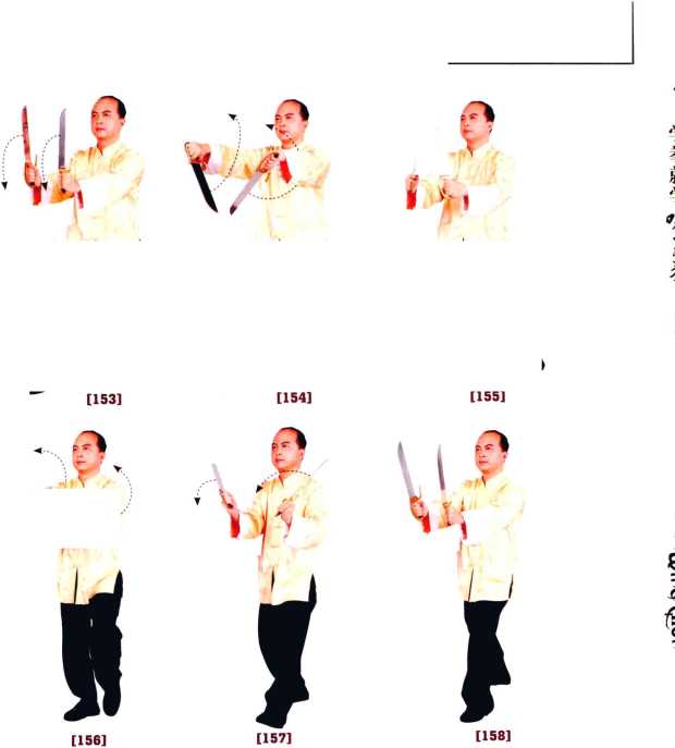 163-164双脚并拢站立两刀合于左肩处且刀背靠于左肩163-164双脚并拢站立两刀合于左肩处且刀背靠于左肩