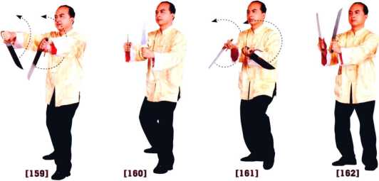 159-162双手转腕舞刀花先转内圈再转外圈。在做外圈时左脚后撤至右脚内侧与双刀转外圈至最后以寸劲竖剁同时到位完成。